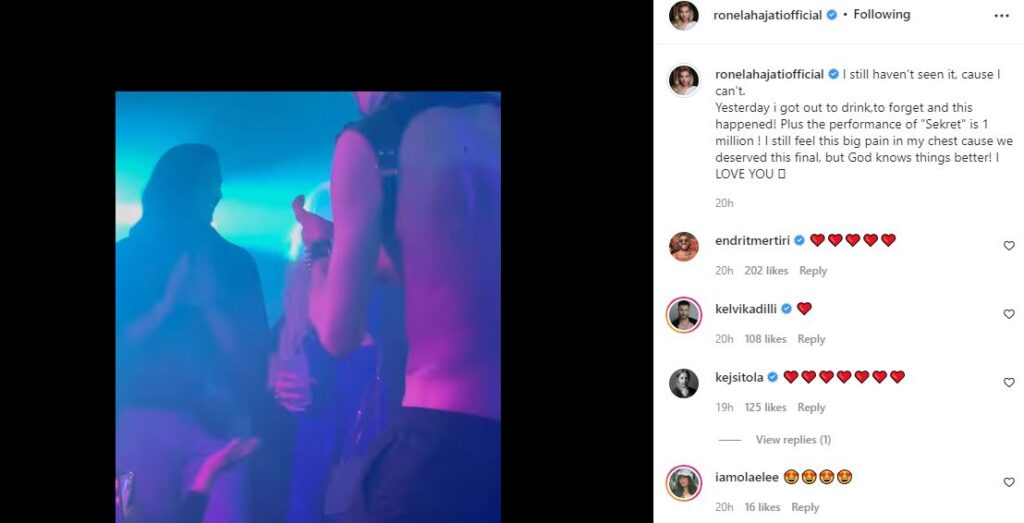 “Ende nuk e kam parë, sepse nuk mundem. Dje dola për të pirë, për të harruar dhe kjo ndodhi! Plus performanca e “Sekret” është 1 milion! Ende e ndjej këtë dhimbje të madhe në gjoks, sepse e merituam këtë finale, por Zoti i di gjërat më mirë! TE DUA“-shkruan ajo.