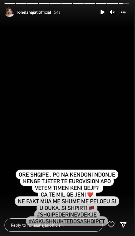 “Ore Shqipe, po na këndoni ndonjë këngë tjetër të Eurovision apo vetëm timen keni qej? Sa të mirë që jeni. Në fakt mua më shumë më pëlqeu si u duka. Si shpirt! #shqipëriaderinëvdekje #askushnuktëdosashqipet”– shkruan këngëtarja në një postim në Instastory, duke iu referuar komenteve negative që sipas saj më së shumti kanë qenë nga shqiptarët.