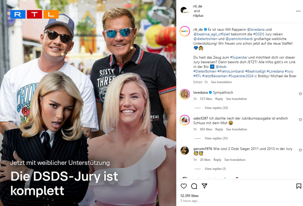 “Me Beatrice Eglin dhe Loredanën, ne mundëm të fitonim dy përfaqësues shumë të suksesshëm të zhanreve të tyre muzikore përkatëse për jurinë e ‘DSDS’. Ne kemi gjetur kastin tonë të dëshiruar për sezonin e 21-të”, shkruhej krahas fotos së tyre.