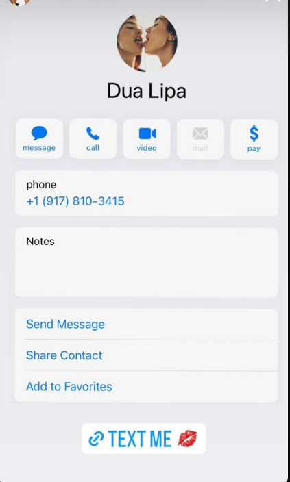 Ylli i muzikës pop e ka publikuar numrin në “Instastory” me mbishkrimin “më shkruaj”. Numri i saj është +1 (917) 810-3415. Mesa duket Dua e ka bërë këtë që komunikojë me fansat dhe adhuruesit e saj.