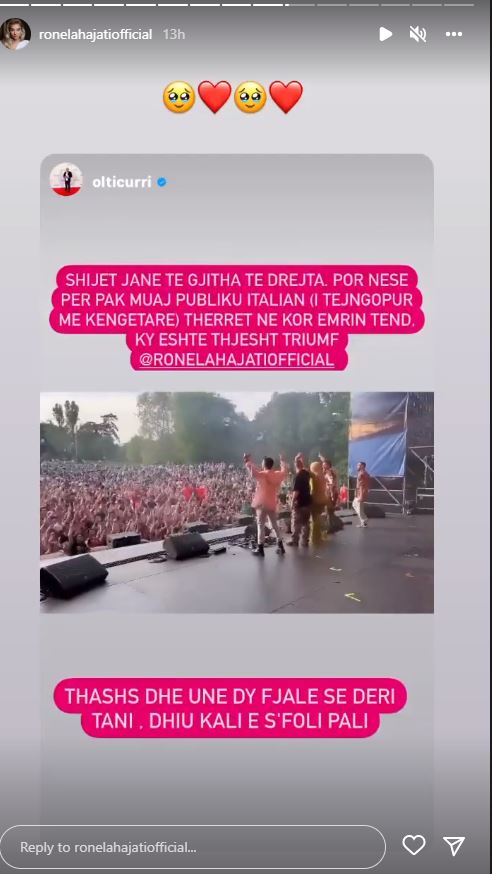 Olti ka reaguar në rrjetin e tij social Instagram, ku krahas një videoje të Ronelës duke performuar shkruan ndër të tjera që shijet janë personale dhe fakti që publiku italian thërret emrin e saj në kor është një triumf.
