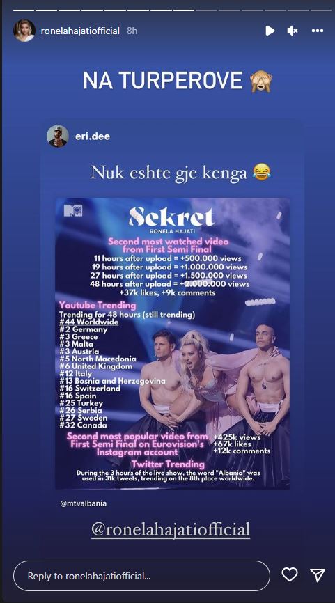 Mirëpo, Ronela ktyre kritikave ka zgjedhur ti kundërpërgjigjet me ‘fakte’ duke treguar suksesin që ajo po korr jashtë Eurovisionit dita ditës. Në InstaStory Ronela ka ironizuar personazhet të cilët e kanë gjykuar për tekstin e këngës teksa në foton e ripostuar tregohet suksesi i këngës anë e mbanë botës dhe kjo gjë mund të dallohet prej shikueshmërisë që ka marrë dhe renditjes në shtete të ndryshme.