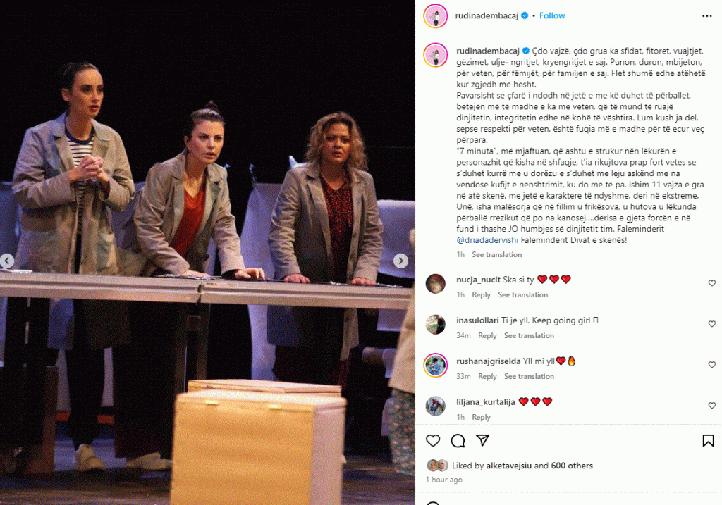 “7 minuta”, më mjaftuan, që ashtu e strukur nën lëkurën e personazhit që kisha në shfaqje, t’ia rikujtova prap fort vetes se s’duhet kurrë me u dorëzu e s’duhet me leju askënd me na vendosë kufijt e nënshtrimit, ku do me të pa. Ishim 11 vajza e gra në atë skenë, me jetë e karaktere të ndyshme, deri në ekstreme. Unë, isha malësorja që në fillim u frikësova, u hutova u lëkunda përballë rrezikut që po na kanosej….derisa e gjeta forcën e në fund i thashe JO humbjes së dinjitetit tim” – ka shkruar aktorja krahas disa fotove.