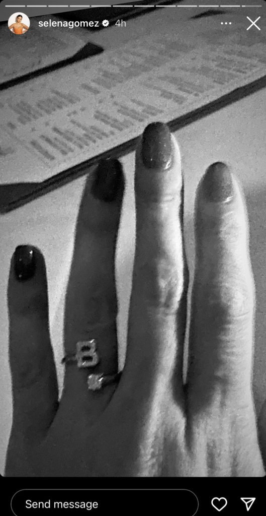 Një tjetër detaj që duket se konfirmoi marrëdhënien e dyshes ishte edhe një tjetër postim që këngëtarja ka bërë në “Instastory’, ku ka ndarë një foto të unazës që mbante në gisht, me inicialin B, që me siguri i referohet Blanco-s.