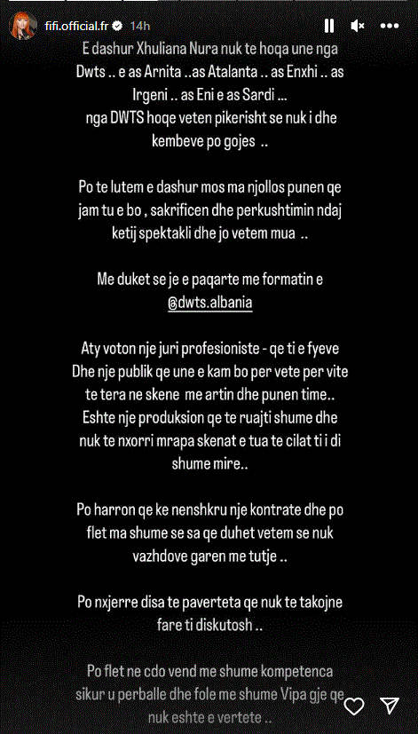 “E dashur Xhuliana Nura nuk të hoqa unë nga DWTS, hoqe veten sepse nuk i dhe këmbëve po gojës. Po të lutem e dashur mos njollos punën time, sakrificën dhe përkushtimin ndaj këtij spektakli. Aty voton një juri profesioniste që ti e fyeve dhe një publik që unë e kam bërë për vete me vite të tëra në skenë me artin dhe punën time. Është një produksion që të ruajti shumë dhe nuk të nxori skenat e tua të cilat ti i di shumë mirë. Po harron që ke nënshkruar kontratë dhe po flet më shumë sesa duhet. Po nxjerr të pavërteta që nuk të takon t’i diskutosh”,– shkruan Fifi mes tjerash.