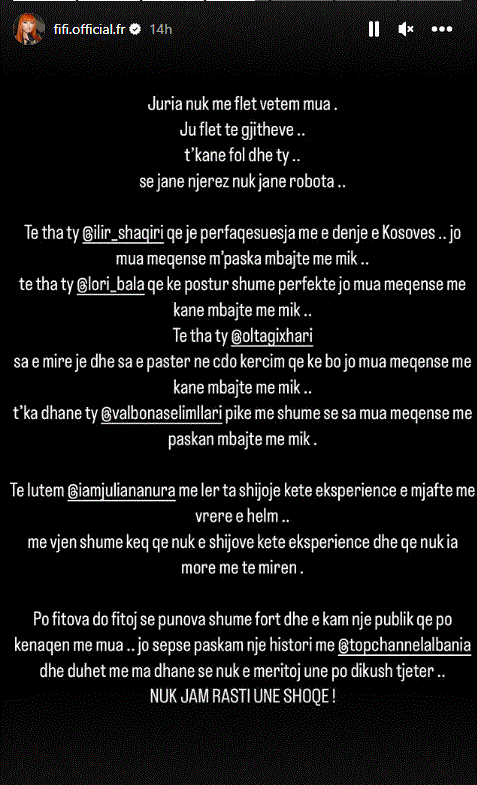 Rreth deklaratës së Julianës, së fundmi ka reaguar vetë Fifi përmes disa postimeve në InstaStory.