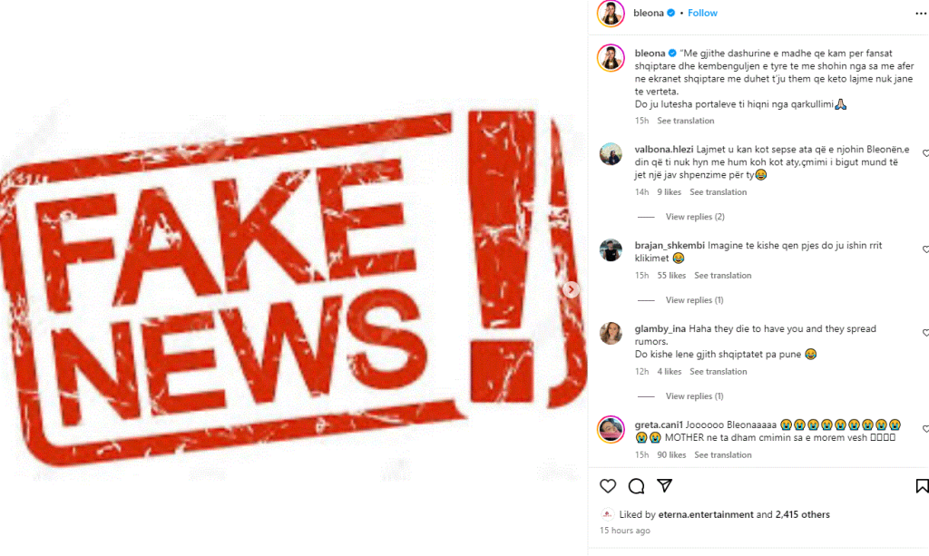 “Me gjithë dashurinë e madhe që kam për fansat shqiptarë dhe këmbënguljen e tyre të më shohin në ekran më duhet t’ju them që këto lajme nuk janë të vërteta”, ka shkruar Bleona.
