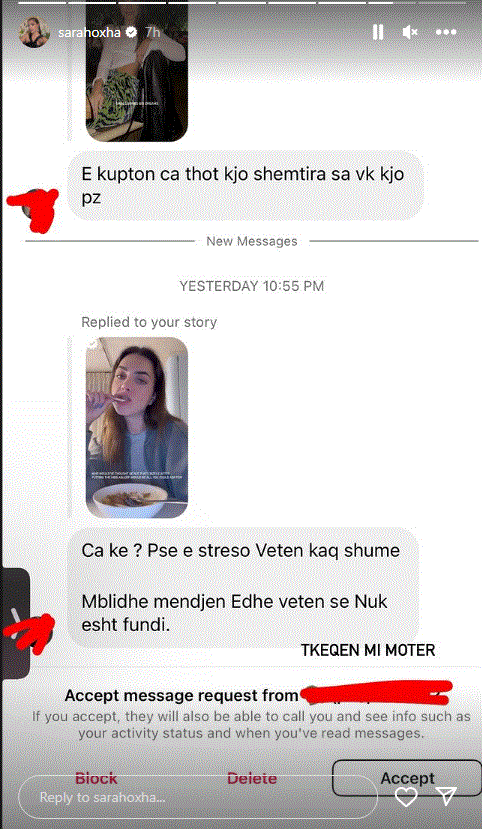 Së fundmi Sara ka postuar në InstaStory një mesazh nga një ndjekëse, e cila e ka ofenduar atë duke thënë: “E kupton ca thot kjo shëmtira sa v*k kjo pz”.