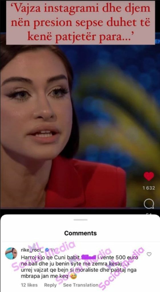 “Harroj kjo qe cuni babit … i vente 500 euro ne ball dhe ju benin syte me zemra kesaj …I urrej vajzat qe bejn si moraliste dhe pastaj nga mbrapa jan me keq” – komenton Rike në videon e postuar ku më pas dhe është fshirë komenti.