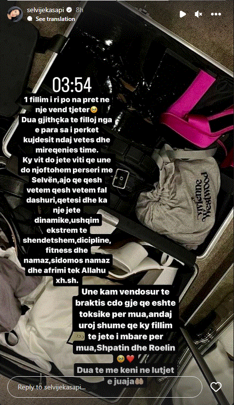 “1 fillim i ri po na pret në një vend tjetër. Dua gjithçka të fillojë nga e para sa i përket kujdesit ndaj vetes dhe mirëqenies time. Ky vit do jetë viti që unë do njihem përsëri me Selvën, ajo që qesh vetëm qesh, vetëm fal dashuri, qetësi dhe ka një jetë dinamike, ushqim ekstrem të shëndetshëm, disiplinë, fitness dhe namaz, sidomos namaz dhe afrimi tek Allahu xh.sh. Unë kam vendosur të braktis çdo gjë që është toksike për mua, prandaj uroj shumë që ky fillim të jetë i mbarë për mua, Shpatin dhe Roelin. Dua të më keni në lutjet e juaja.”- ka shkruar Selvija krahas fotos së valixhes të mbushur me rroba.