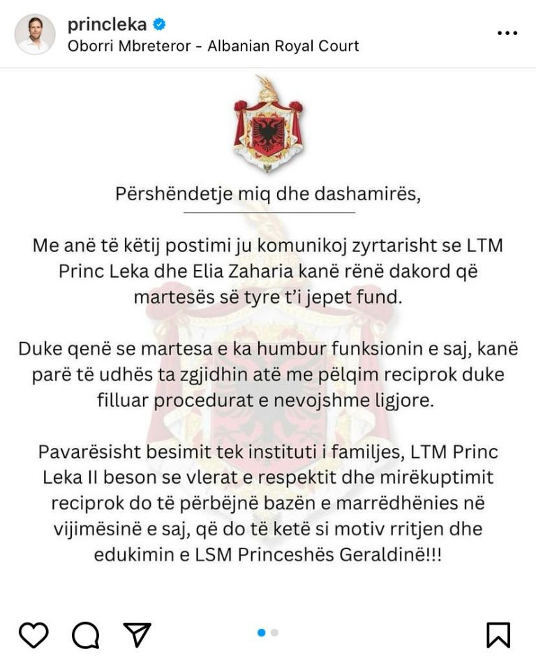 Me anë të këtij postimi ju komunikoj zyrtarisht se LTM Princ Leka dhe Elia Zaharia kanë rënë dakord që martesës së tyre t’i jepet fund.