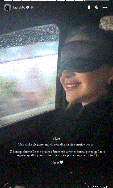 U kënaqa shumë! Po më pyesni çfarë ishte surpriza sonte por ja që Lui u sigurua që dhe ju të shihnit një copëz prej saj nga ne të tre. Nesër…”- ka shkruar Kiara krahas fotos ku duket ajo me sytë e mbyllur me një shami, ndërsa akoma nuk ka zbuluar cila ishte surpriza që Luizi i bëri.