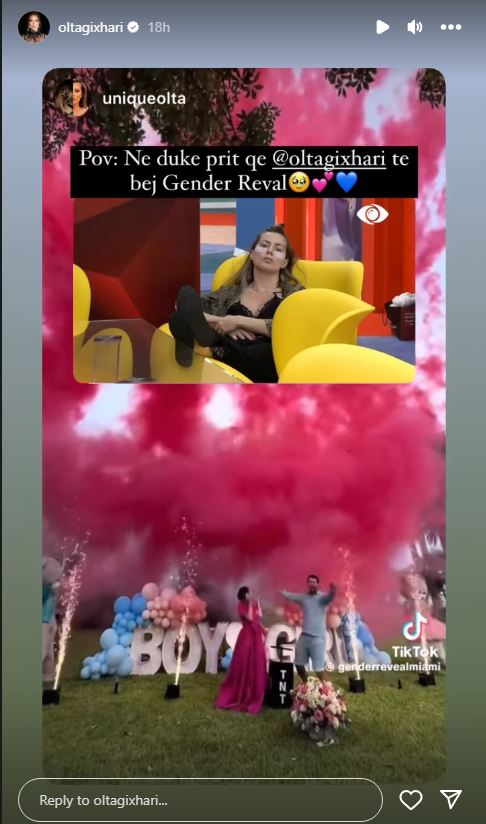 Aktorja ka ripostuar në InstaStory një video të fanses së saj, në festën e “gender reval” ku një ccift kanë zbuluar se gjinia është vajzë.