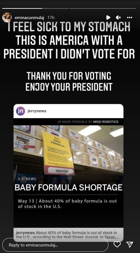 Emina për këtë mungesë në vendin ku jeton ka reaguar e rervoltuar në Instagramin e saj. Ndër të tjera, në storin e postuar Emina fajson presidentin aktual të Amerikës Joe Biden, duke shprehur edhe jopëlqimin e saj për të.