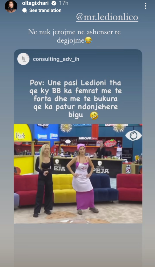 Së fundmi aktorja ka reaguar përmes një postimi në InstaStory, teksa “thumboi” Ledionin duke treguar se nuk i ka pëlqyer aspak kjo ulje që iu ka bërë vajzave të sezonit të kaluar.
