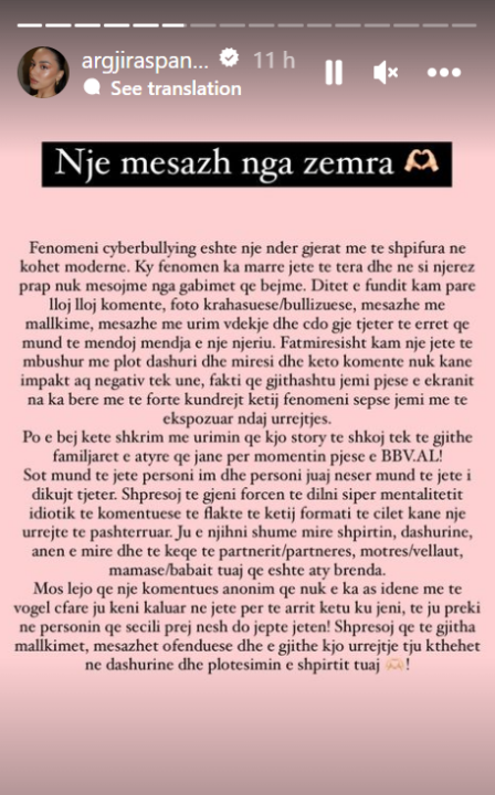 “Po e bëj këtë shkrim me urimin që kjo story të shkoj tek të gjithë familjarët e atyre që janë për momentin pjesë e BBVA! Sot mund të jetë personi im dhe personi juaj nesër mund të jetë i dikujt tjetër. Shpresoj të gjeni forcën të dilni sipër mentalitetit idiotik të komentuese të flaktë të këtij formati, të cilët kanë një urrejte të pashterruar. Ju e njihni shumë mirë shpirtin, dashurinë, anën e mirë dhe të keqe të partnerit/partneres, motrës/vellaut, mamasë/babait tuaj që është aty brenda. Mos lejo që një komentues anonim që nuk e ka as idenë më të vogël cfarë ju keni kaluar në jetë për të arritur këtu ku jeni, t’ju prekë në personin që secili prej nesh do jepte jetën! Shpresoj që të gjitha mallkimet, mesazhet ofenduese dhe e gjithë kjo urrejtje tju kthehet në dashurinë dhe plotësimin e shpirtit tuaj”, perfundon Argjira.