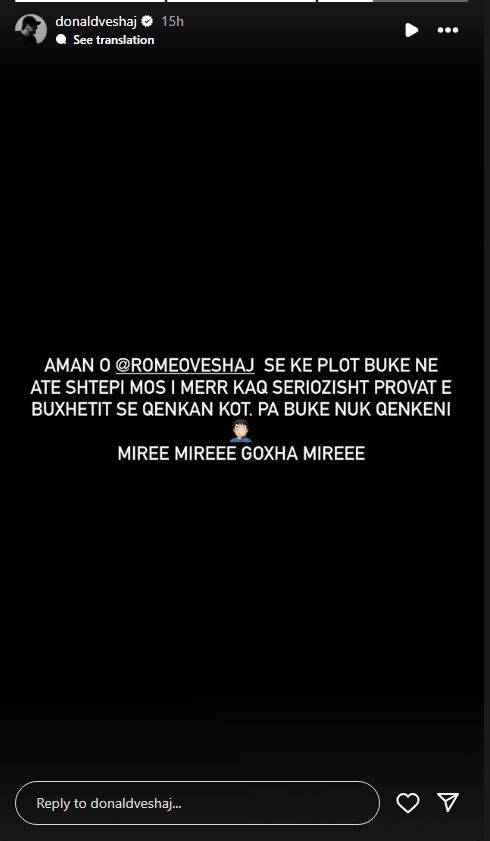 “Aman o Romeo Veshaj se ke plot bukë në atë shtëpi, mos i merr kaq seriozisht provat e buxhetit se qenkan kot. Pa bukë nuk qenkeni. Mirë mirë, goxha mirë”- ka shkruar Donaldi.
