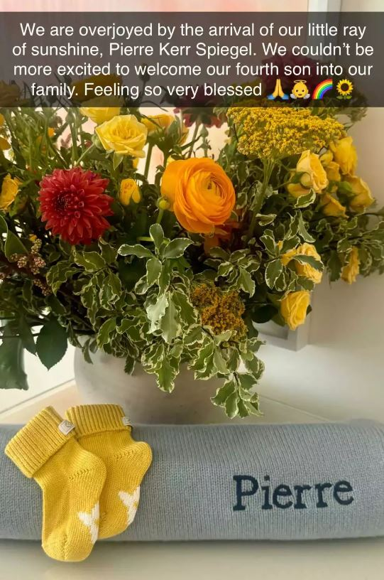 Kerr ndau gjithashtu një foto të buqetës me lule, të vendosur pranë një palë çorape të verdha për fëmijë dhe një batanije blu për bebe që shkruante “Pierre”.