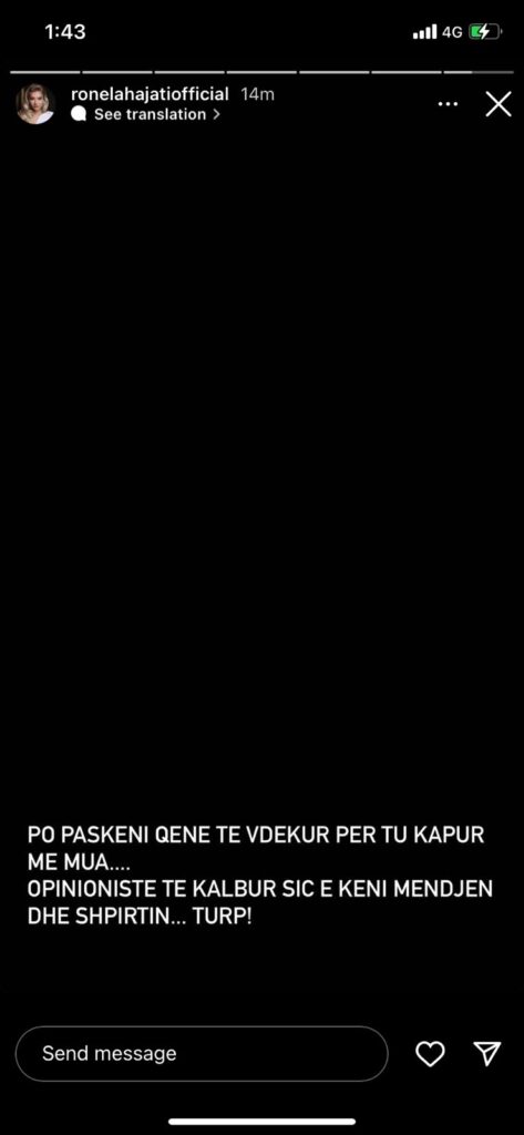 Këngëtarja nuk ka etiketuar publikisht asnjë person por shkruan: “Paskeni qenë të vdekur për tu kapur me mua. Opinionistë të kalbur siç e keni mendjen dhe shpirtin… Turp!”