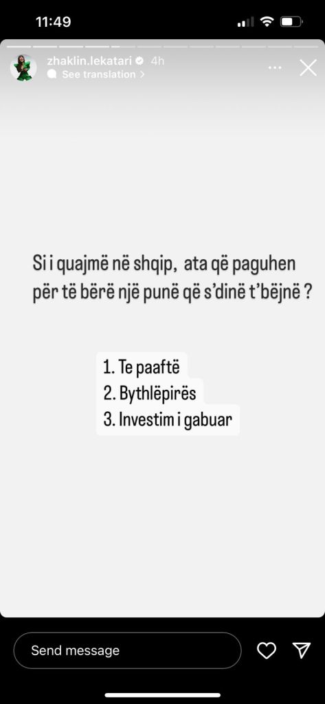 “Si i quajmë në shqip, ata që paguhen për të bërë një punë që s’dinë ta bëjnë? Të paaftë, b*thlëpirës, apo investim i gabuar”, ka shkruar Zhaklina.