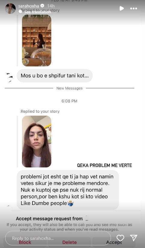 Blogerja e njohur Sara Hoxha ka fituar simpatinë e ndjekësve të saj por mesa duket jo të të gjithëve. Sara është aktive në rrjete sociale ku ndan shpesh detaje nga përditshmëria, por një postim i fundit duket se nuk i ka pëlqyer një prej ndjekësve të saj të cilës i shkruan: “Ti ia hap vetë namin vetes sikur je me probleme mendore”.