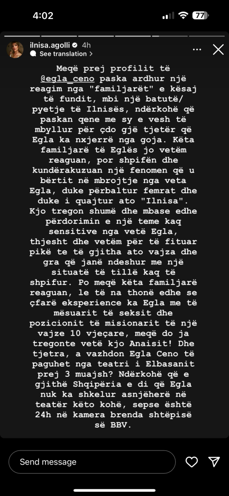 “Meqë prej profilit të Egla Cenos paska ardhur një reagim nga familjarët e kësaj të fundit, mbi një batutë ose pyetje të Ilnisës, ndërkohë që paska qenë me sy e vesh të mbyllur për çdo gjë tjetër që Egla ka nxjerrë nga goja. Këta familjarë të Eglës jo vetëm reaguan, por edhe shpifën dhe kundërakuzuan një fenomen që u bërtit në mbrojtje nga vetë Egla, duke përbaltur femrat dhe i quajtur ato Ilnisa. Meqë familjarët reaguan le të na thonë edhe se çfarë eksperience ka Egla me të mësuarit të seksit dhe pozicionit të misionarit të një vajze 10 vjeç, meqë do ja tregonte vetë kjo Anaisit. A vazhdon Egla të paguhet nga teatri i Elbasanit prej 3 muajsh? Ndërkohë që e gjithë Shqipëria e din që Egla nuk ka shkeluar asnjëherë në teatër për këto kohë, sepse është 24 orë në kamera brenda shtëpisë së Big Brother”– shkruhej në postimin e bërë në llogarinë zyrtare të Instagram të Ilnisa Agollit.
