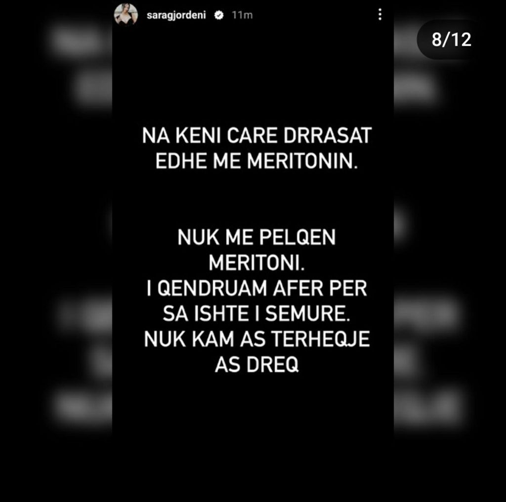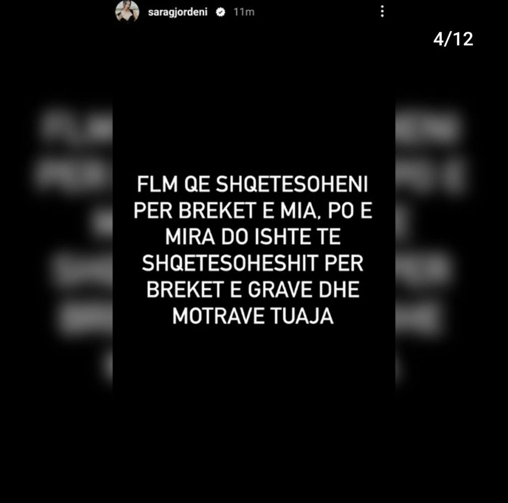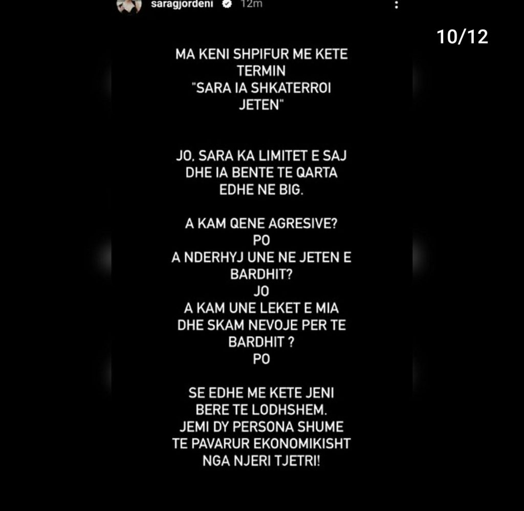 “Faleminderit që shqetësoheni për brekët e mia, por e mira do ishte të shqetësoheshit për brekët e grave dhe motrave tuaja”- shprehet kështu ish-konkurrentja e ‘BBV3’, Sara Gjordeni, e cila nëpërmjet disa postimeve në Instastory ka sqaruar për të 100-ën herë ‘akuzat’ dhe ‘shpifjet’ e ngritura për të.