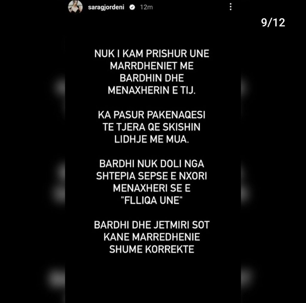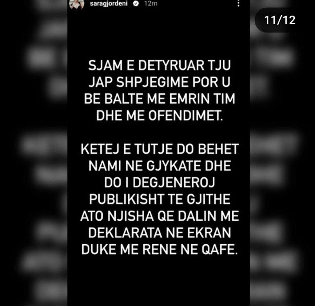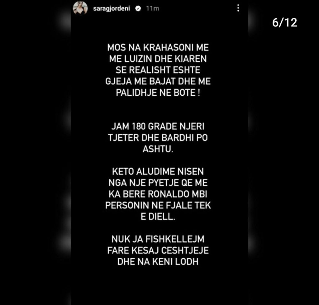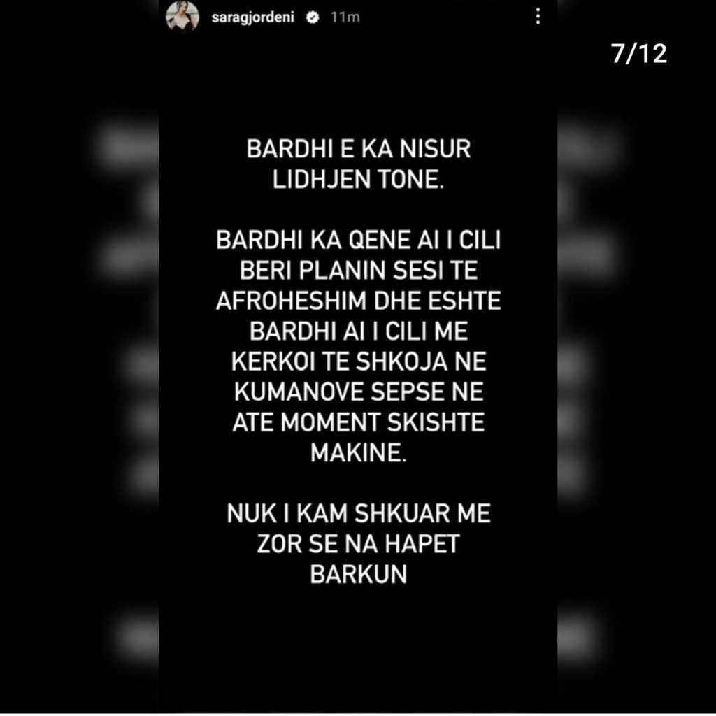 “Faleminderit që shqetësoheni për brekët e mia, por e mira do ishte të shqetësoheshit për brekët e grave dhe motrave tuaja”- shprehet kështu ish-konkurrentja e ‘BBV3’, Sara Gjordeni, e cila nëpërmjet disa postimeve në Instastory ka sqaruar për të 100-ën herë ‘akuzat’ dhe ‘shpifjet’ e ngritura për të.