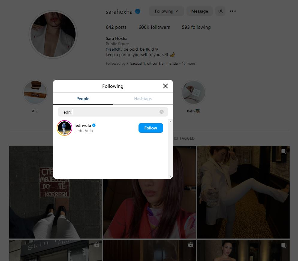 Ka qenë influencerja e cila së fundmi ka vendosur që të ndjek në Instagram Ledrin, por ndryshe nga ajo reperi nuk e ndjek në rrjetet sociale ish-partneren e tij.