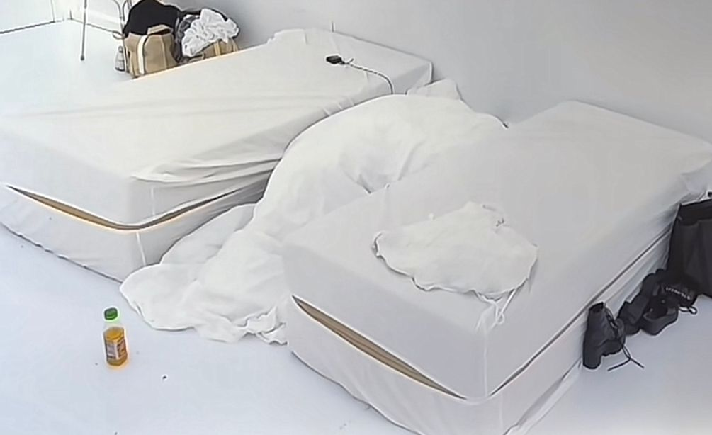 Në pamje shihet Meriton Mjekiqi dhe gazetarja të shtrirë në tokë mes dy krevateve të mbuluar me jorgan.
