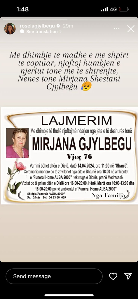 Këngëtarja shkodrane, Rosela Gjylbegu ka njoftuar ndarjen nga jeta të nënës së saj Mirjana Giylbegu.