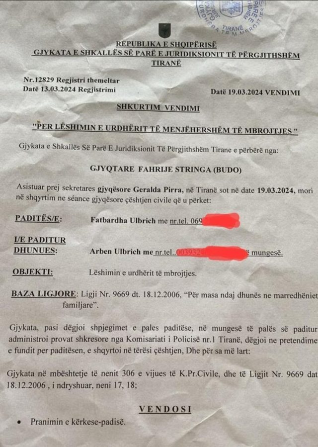 Në një vendim gjyakte që mban datën 19 mars 2024, bashkëshorti i Mayas (Fatbardha Ulbirch) urdhërohet t’i qëndrojë 200 metra larg.
