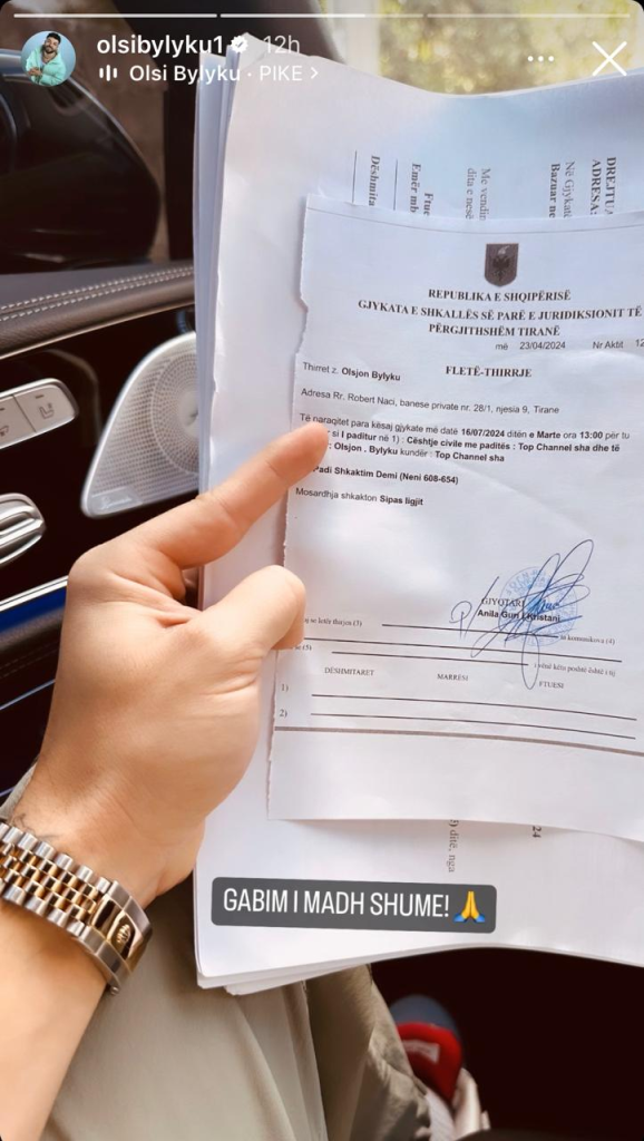 “Padi për shkaktim dëmi”, shkruhet në fletëthirrjen e Gjykatës së Tiranës, ndërsa Olsi Bylyku ka shkruar në postim në InstaStory: “Gabim i madh shumë”.