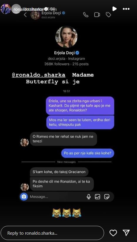 Në bisedën e sajuar në Instagram, aktori ka flirtuar me Erjolën duke e ftuar atë për kafe, megjithëse kjo e fundit nuk ka pranuar që të dalë me të, duke ia lënë seen fillimisht.