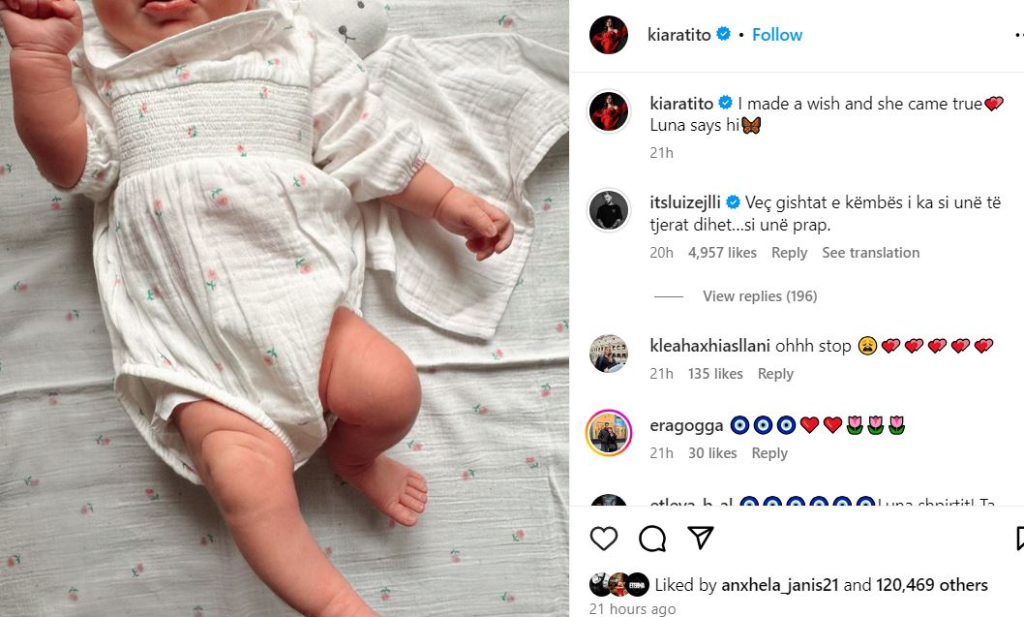 Moderatorja Kiara Tito dhe Luiz Ejlli dy javë më parë janë bërë prindër për herë të parë, e vogla e tyre Luna Mari Ejlli ka ardhur në jetë.