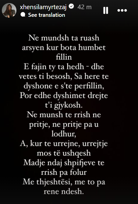 Mbrëmjen e sotme, Xhensila ka bërë një postim në profilin e saj të Instagramit, një poezi të Rudyard Kipling, të titulluar ” Në mundesh”.