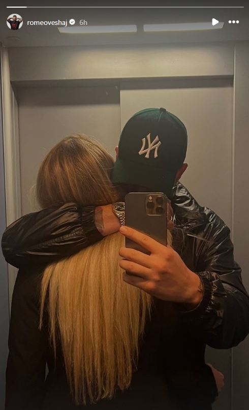 Romeo Veshaj dhe Heidi Baçi kanë pozuar së bashku në ashensor, ku aktori shfaqet duke e përqafuar ndërsa e dashura e tij qëndron me kurriz nga kamera.