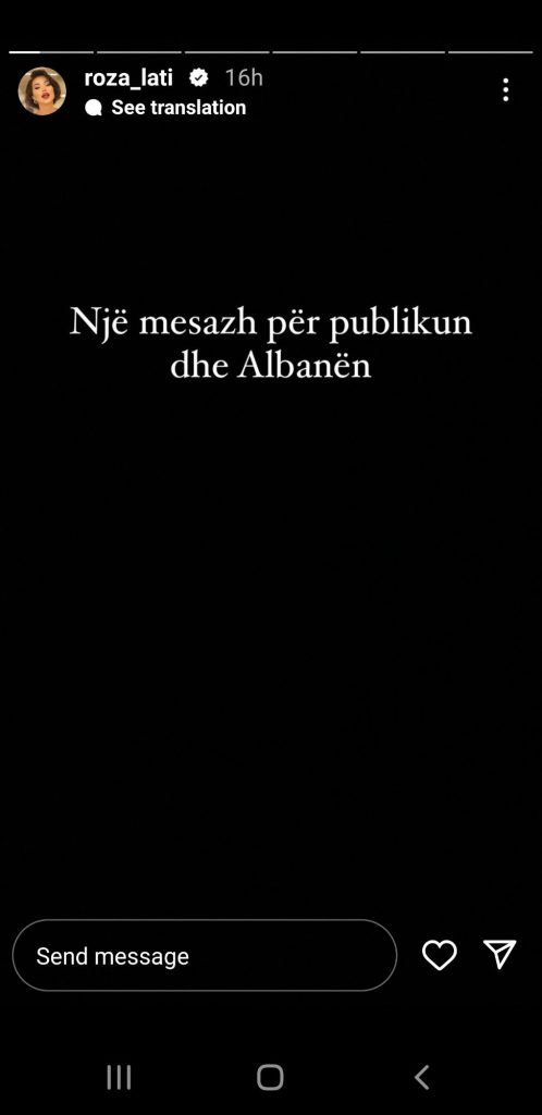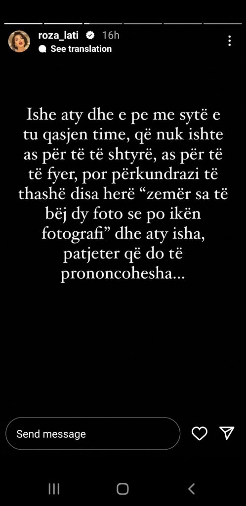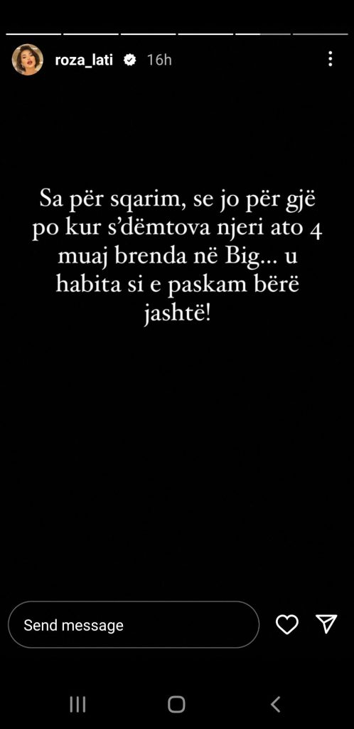 “Një mesazh për publikun dhe Albanën. Meqë je në të 20-tat dhe jo në 40-tat prano një këshillë miqësore nga unë. Ishe aty dhe e pe me sytë e tu qasjen time që nuk ishte as për të të shtyrë as për të të fyer, por të thashë disa herë, ‘zemër sa të bëjë dy foto, se po ikën fotografi’ dhe aty isha patjetër që do të prononcohesha. Sa për sqarim, kur nuk dëmtova njeri sa isha brenda në Big Brother, u habita si e paskam bërë jashtë”, ka shkruar Roza.