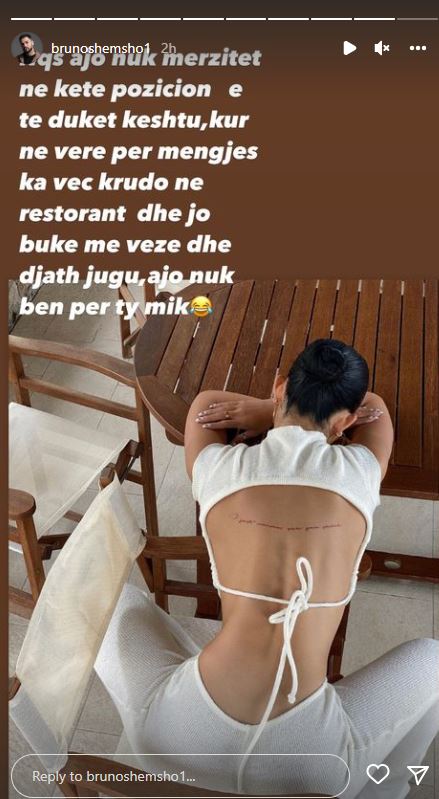 “Nëqoftëse ajo nuk vjen në Manastir apo në Pasqyra ose Ksamil me ty, të bëjë foto kështu me shishen e ujit Pana në dorë plus të duket si @amandakhamkaeë, por zgjedh të hedhë shishet e Grez Goose dhe Moet në një natë vere me fishekzjarrë midis club-it, ajo nuk është për ty mik,” ka shkruar Bruno në story.