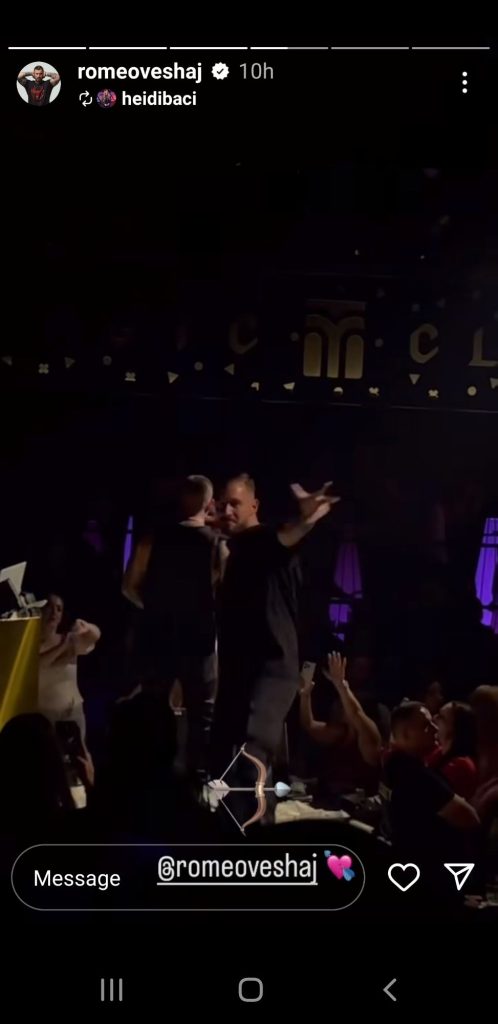 Aktori Romeo Veshaj në orët e para të mëngjesit performoi në një ndër lokalet e Tiranës së bashku me mikun e tij, këngëtarin Elgit Doda. Romeo u shoqërua nga partnerja e tij Heidi Baçi, ndërsa një moment teksa po këndonte në skenë ai i ka drejtuar gishtin të dashurës së tij.