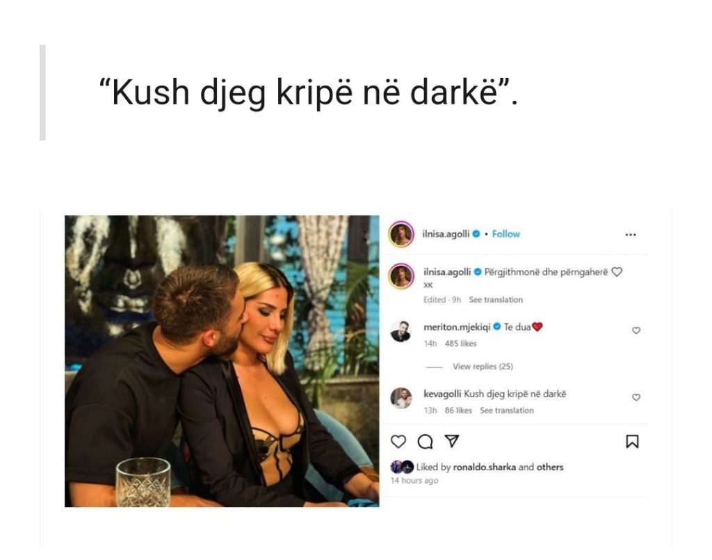 Gazetarja Ilnisa Agolli ka ndarë me ndjekësit në Instagram një moment romantik me partnerin e saj, moderatorin Meriton Mjekiqi.