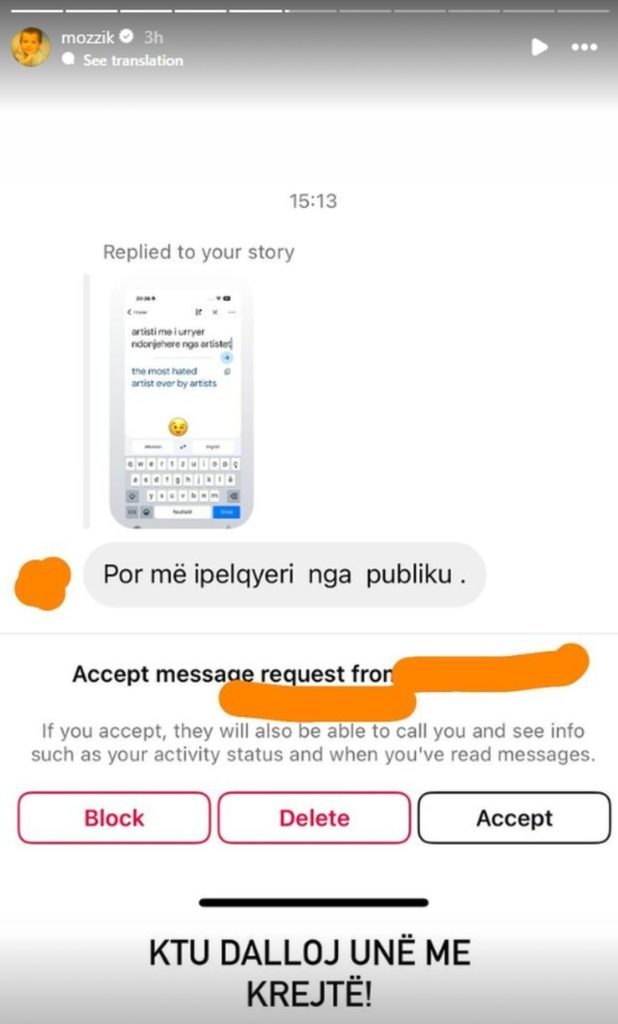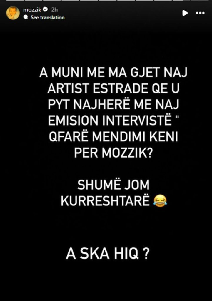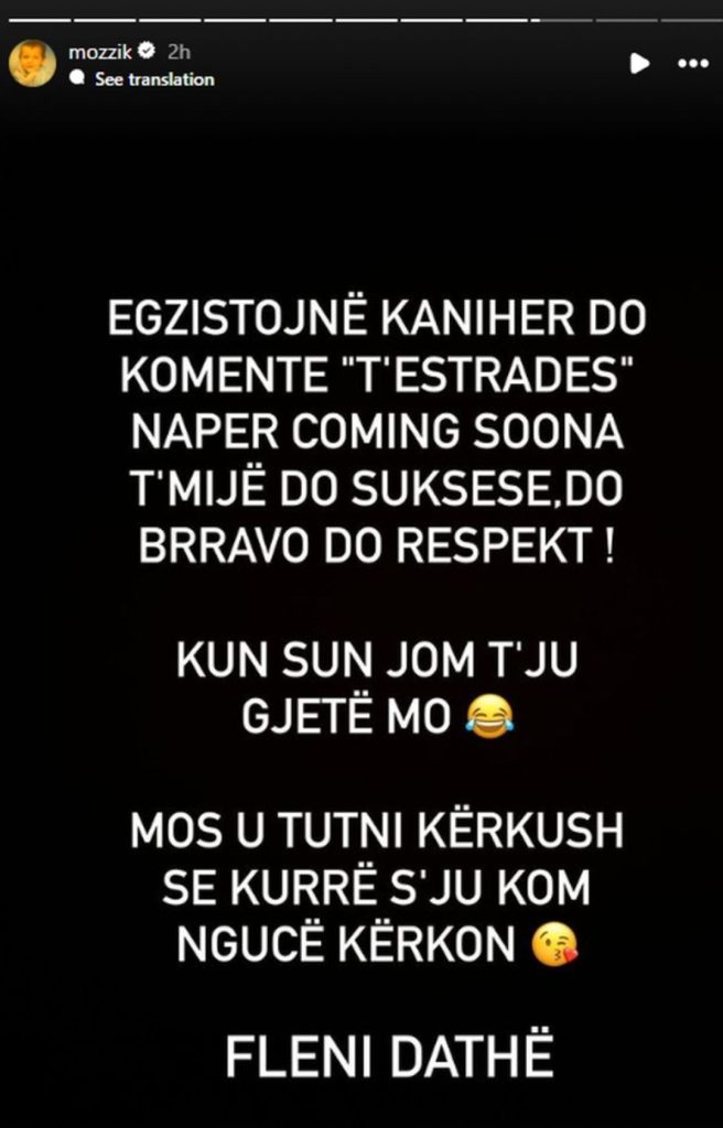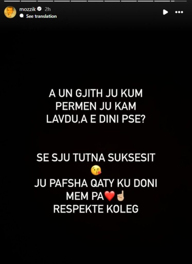 “A muni me ma gjet naj artist të Estradës që u pyt najherë me naj emision “Çfarë mendimi keni për Mozzik?” Shumë jam kurreshtar. A s’ka hiç? A unë gjithë ju kam përmend, ju kam lavdu, e dini pse? Se s’ju tutna suksesit. Ju pafsha aty ku doni mem pa.”