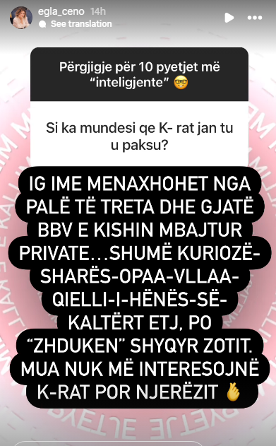 “IG ime menaxhohet nga palë të treta dhe gjatë BBV e kishin mbajtur private… Shumë kuriozë-sharës-opaa-vllaa-qeielli-i-hënës-së-kaltërt etj. Po ‘zhduken’ shyqyr Zotit. Mua nuk më interesojnë K-rat por njerëzit”, ishte përgjigja e aktores së njohur.
