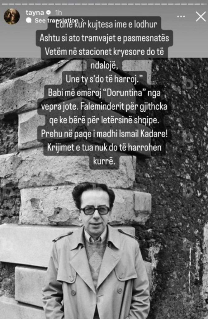 Në statusin e saj ajo shkruan: “Edhe kur kujtesa ime e lodhur ashtu si ato tramvajet e pasmesnatës. Vetëm në stacionet kryesore do ndalojë. Unë ty sdo të harroj”. Babi më quajti Doruntina nga vepra jote. Faleminderit për gjithçka që ke bërë për letërsinë shqipe. Prehu në paqe I madhi Ismail Kadare! Krijimet e tua nuk do të harrohen kurrë”.