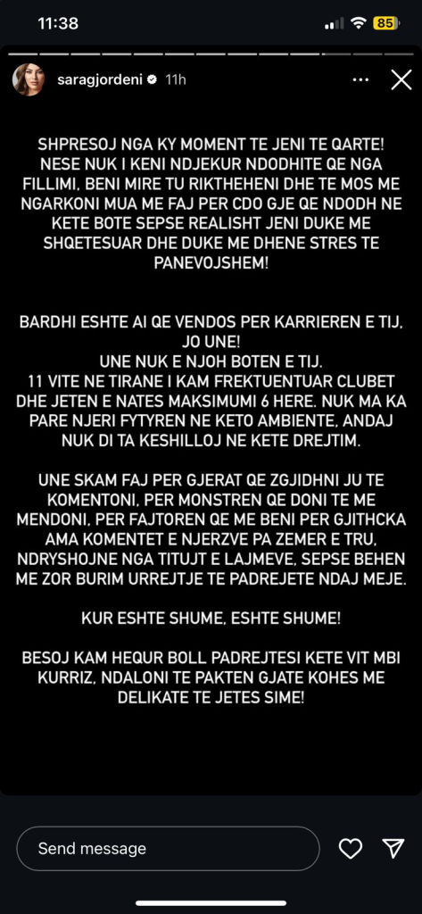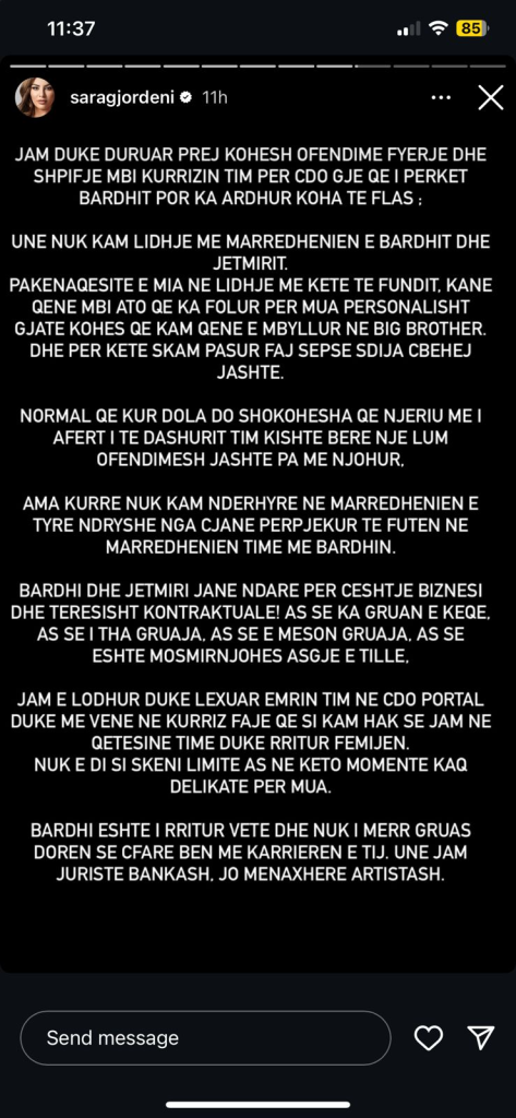 Sara Gjordeni ka reaguar pas thashethemeve se ishte pikërisht ajo “molla e sherrit” që çoi në përfundimin e kontratës mes Bardhit dhe menaxherit të tij, Jetmir Agaj, i cili doli hapur kundër lidhjes së tyre teksa çifti ishin në Big Brother Vip.