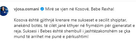 Kosova është gjithnjë krenare me sukseset e secilit shqiptar, anekënd botës, të cilët janë kthyer në frymëzim për gjeneratat e reja. Suksesi i Bebes është shembull i jashtëzakonshëm se çka mund të arrihet me punë e përkushtim!”