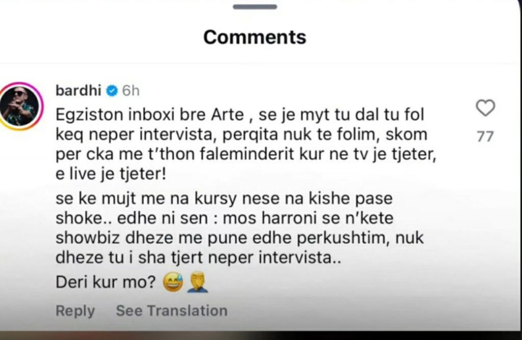 Në një koment ai i drejtohet Artës në emër duke i thënë se nuk mund ta falenderonte kur si për të dhe për Sarën në çdo intervistë që ajo ka dhënë i ka sharë.