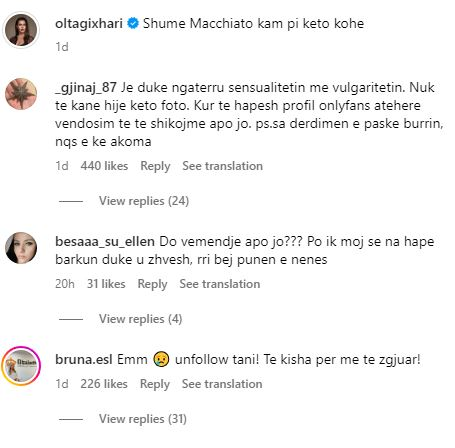 Të tilla kanë qenë komentet që thonin: “Je duke ngatërruar sensualitetin me vulgaritetin. Nuk të kane hije këto foto. Kur të hapësh profil onlyfans atëhere vendosim të të shikojmë apo jo. Sa derdimen e paske burrin, nëqoftë se e ke akoma,’ ‘Emm..unfollow tani!’ ‘Të kisha për më të zgjuar!,’ ‘Po më vjen shume keq që po më shikojnë sytë një grua 38 vjecare me dy femijë, të shkojë gruaja të dali lakuriq vetëm për të marrë famë kjo është e turpshme sepse nuk vendoset fama përpara femijës për mua është turp i madh”.