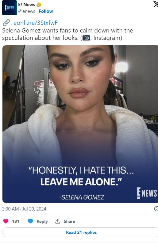Gomez e befasoi Barrionuevo duke iu përgjigjur TikTok-ut të saj. “Sinqerisht e urrej këtë. Unë kam bërë botox. Kjo eshte e gjitha. Më lini të qetë”, ka komentuar 32-vjeçarja.