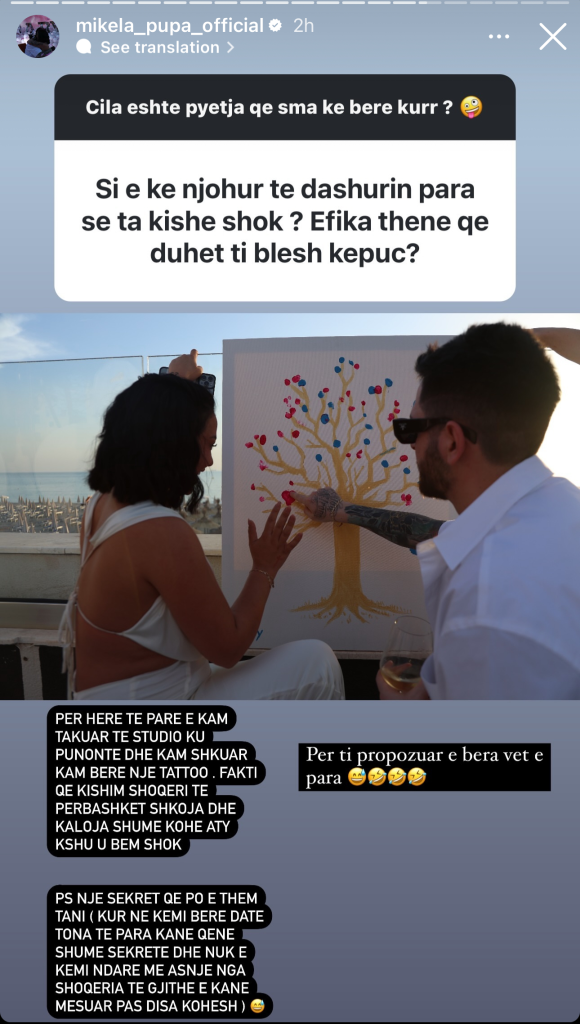 Mikela tregon se gjithçka nisi në studion e Tattoo ku ai punon me Efin dhe fillimisht ishin thjesht miq. Më pas, Mikela thotë se kanë dalë nëpër takime por askush nga miqtë nuk ishte në dijeni se mes tyre po lindte diçka.